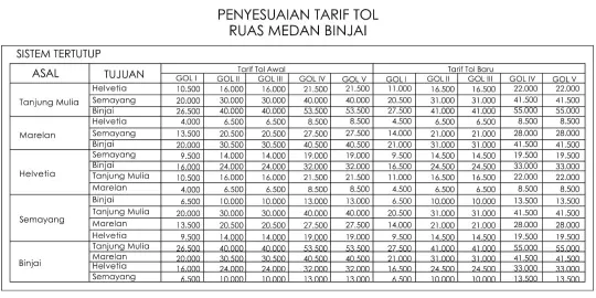 General Manager Teknik Operasi and Maintenance PT. Medan Binjai Toll, Peri Joni, menyampaikan bahwa penyesuaian tarif ini sejalan dengan Surat Keputusan (SK) Menteri Pekerjaan Umum No. 684/KPTS/M/2025 pada 22 Juli 2025 dan telah dilakukan sosialisasi sesuai dengan SE Menteri PUPR No. 2/SE/M/2024 tentang panduan komunikasi publik tentang tarif tol awal dan penyesuain tarif tanggal 7 Maret 2024.