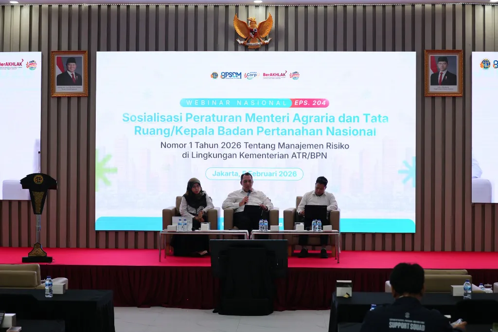 Jakarta – Kementerian Agraria dan Tata Ruang/Badan Pertanahan Nasional (ATR/BPN) memperkuat penerapan manajemen risiko dalam meningkatkan kualitas pelayanan publik melalui terbitnya Peraturan Menteri (Permen) ATR/Kepala BPN Nomor 1 Tahun 2026 tentang Manajemen Risiko. Peraturan tersebut menjadi fondasi tata kelola organisasi yang terintegrasi, sistematis, dan berkelanjutan. Untuk meningkatkan pemahaman jajaran terhadap kebijakan tersebut, Kementerian ATR/BPN menggelar Webinar Sosialisasi Permen ATR/Kepala BPN 1/2026 tentang Manajemen Risiko, secara daring dan luring di Aula Prona, Jakarta, Kamis (05/02/2026).